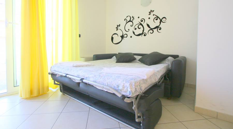 MONO 2: soggiorno con divano a due posti letto, angolo cottura attrezzato, bagno di servizio (con lavabo, wc e box doccia). Alcuni con vista mare.