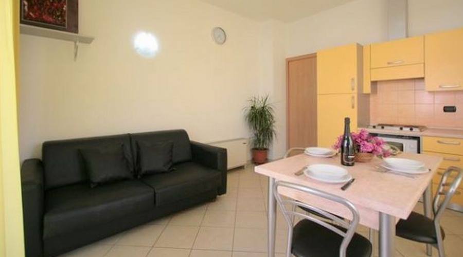 MONO 4: soggiorno con divano a due posti letto e corridoio con 2 letti a castello a scomparsa, angolo cottura attrezzato, bagno di servizio (con lavabo, wc e box doccia).